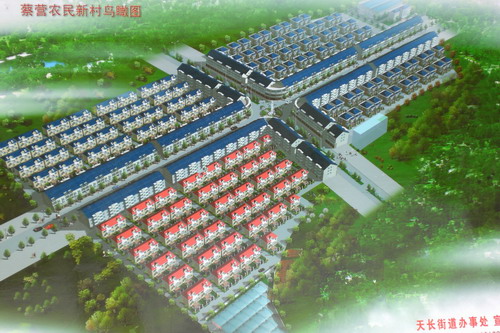 为促进新农村建设加快发展,大圹圩农场本着互惠双赢的原则,就新农村共建问题主动与地方有关部门多次沟通洽谈,并就诸多问题达成共识,:农场和新农村规划区将对交通、下水道、自来水、电力、电信、通讯等相关辅助设施实行资源共享、共同建设,农场将发挥现有资源优势,积极为新农村建设提供服务;农场职工可以到蔡营新农村小区购置房屋居住,享受蔡营村村民同等待遇。图为:蔡营村新农村规划区鸟瞰图和小区建筑模型图。
