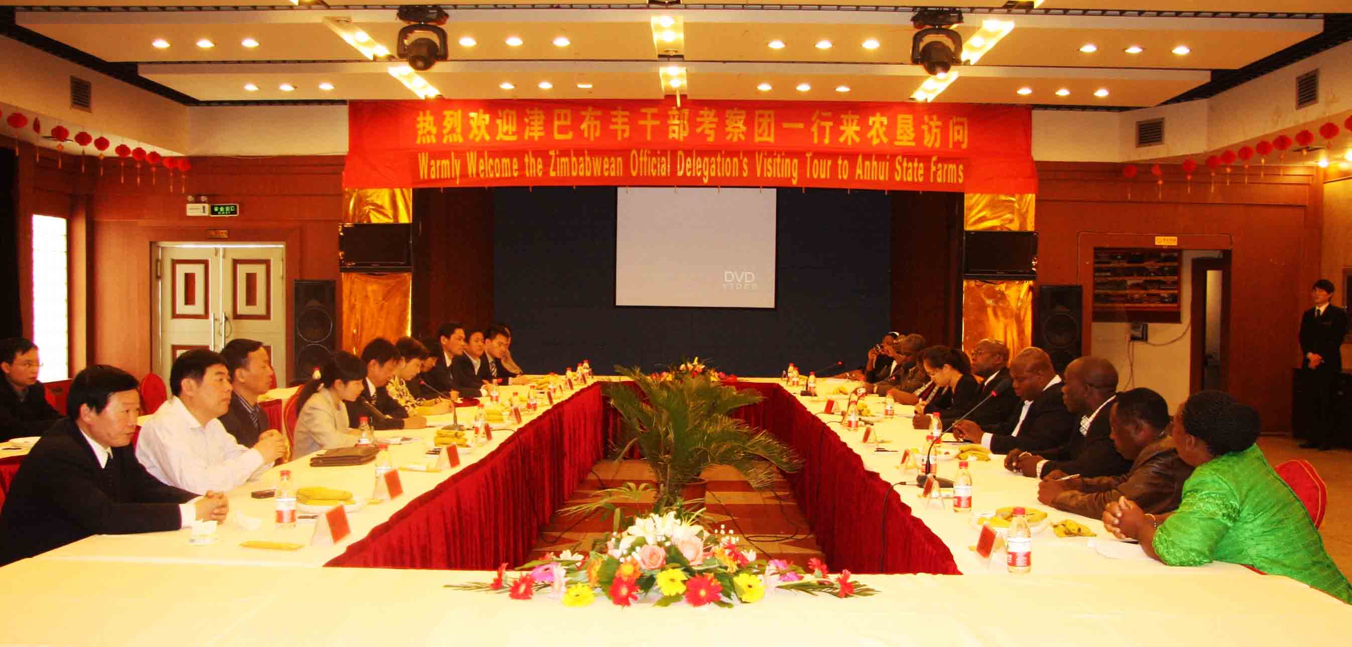 随后,安徽农垦集团副总经理王占廷主持召开座谈会,对远道而来的非洲朋友表达了真诚热烈的欢迎。会议播放了英语版的《安徽农垦》专题宣传片,介绍了近年来安徽农垦实施三化战略、深化体制改革、调整产业结构、转变发展方式、努力促进三增、实现垦区全面发展的情况。王占廷着重介绍了安徽农垦集团与津巴布韦农业合作项目的实施和进展情况。
