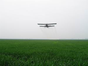 图片说明:近日,龙亢农场针对小麦不同程度地发生 白粉病和锈病的现状,对全场3万亩良种田实施飞机 防治作业。在飞防中,农场农业专家还根据由于低 温造成小麦长势弱、穗头小的实际,实施业面喷施 微肥。据农业专家介绍,农场实施飞防作业,小麦 单产可提高15-20%%,仅此,龙亢农场就可增加小麦 良种产量近30万公斤。图为飞机在田间作业。 ( 邵乃昌)