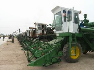 为迎接即将到来的"三夏"战役,潘村湖农场于5月27 日在全场范围内开展了一次农机和安全生产检查活 动.图为四分场收割机手早早将自家的收割机整齐有 序地停放在晒场,接受场安委会的检查。